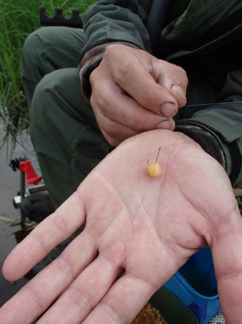Как ни странно, но этот момент может вызвать определенные трудности. На тонкий острый крючок горошина насаживается просто: нужно проколоть ее крючком. Жало крючка в обязательном порядке должно быть выведено наружу. Так можно насаживать и пару горошин — лишь бы размер крючка позволял. Ничто не мешает использовать для горошины подсадку, в первую очередь червя, реже опарыша. Толстые — «карповые» — крючки при насаживании ломают горошину, поэтому прокалывать ее нужно возле росточка, который, если присмотреться, имеется на горошине. Если при этом не выводить жало крючка, то при поклевке подсечка строго обязательна! Сколько у меня было раз, когда даже «паровозные» карповые поклевки заканчивались ничем только потому, что не было своевременной подсечки… Да и на поплавочную удочку или полудонку подсечка должна быть весьма энергичная.