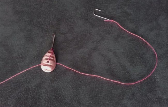 Теперь берем леску и кончик продеваем в ушко мормышки, необходимо ее взять с запасом. Ведь на некотором расстоянии от мормышки у нас должен будет располагаться крючок. Поэтому этого запаса должно хватить для крючка.