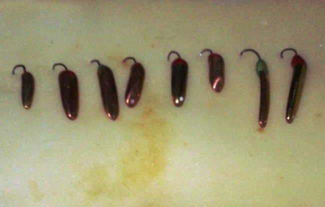 Оптимальное соотношение вес/размер это две правые блесны. Для неопытных рыбаков ( кто ещё не научился наматывать леску на руки ) можно припаивать фабричный крючок, с бородкой. У меня крючки сделаны из пружинной проволоки и без бородки, для чего? Да ленивый я, а если серьёзно, то при морозе не надо снимать перчаток — постучал рыбой об лёд — она сама отцепится ( да и побыстрее будет и руки не мёрзнут ). Ещё добавлю — перед рыбалкой не забывайте перевязывать блёсна. Я леску продеваю в ушко два раза, затем делаю узел, но какая бы леска не была прочная — она просто может перетереться.