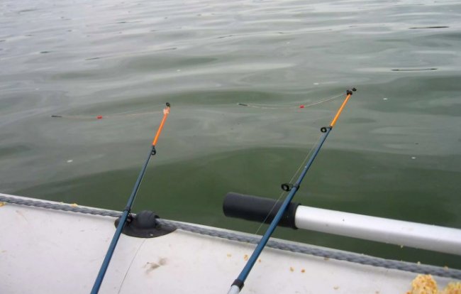 На больших водоемах (крупных озерах, водохранилищах) даже при наличии ДОВОЛЬНО заметного течения с лодки с успехом можно ловить в отвес не только хищных, но и мирных рыб. Донка для отвесной ловли - это удочка с коротким (40-50 см) удильником, леской диаметром 0, 2-0, 25 мм, глухим или скользящим грузилом и одним-двумя поводками с крючком № 4-6. На удочке обязательно должен быть кивок для сигнализации поклевки. Желательно оборудовать ее и катушкой с запасом лески не менее 20-25 м. На достаточно глубоких участках водохранилищ многие рыболовы используют обычные зимние удочки, но донка все же удобнее. При оборудовании удочки глухим грузилом ПОВОДОК с крючком привязывают к леске выше него на 12-15 см. Длина поводка зависит от течения: чем оно сильнее, тем длиннее поводок. Обычная его длина от 16 до 60 см. Однако при использовании скользящего грузила длину поводка следует уменьшить: на слабом течении она не должна превышать 8-10 см.
