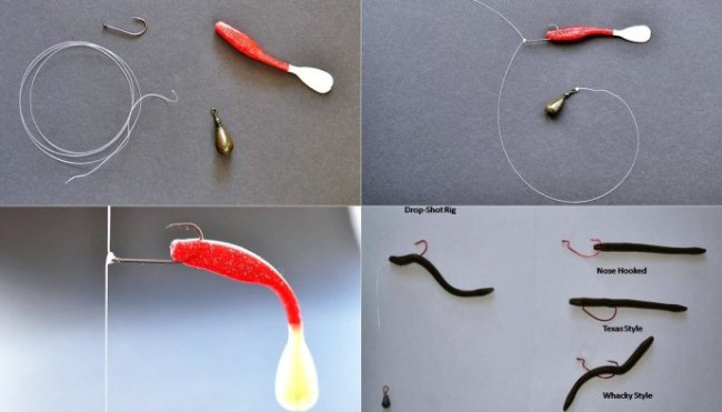 В наше время много производителей выпускают крючки, предназначенные именно для дроп-шота. Они обязательно должны быть с колечком (ушком) для продевания лески. Привязать приманку к крючку можно абсолютно любой техникой, главное, чтобы он хорошо удерживал приманку и не развязался во время выполнения подсечки и вытаскивания добычи.
