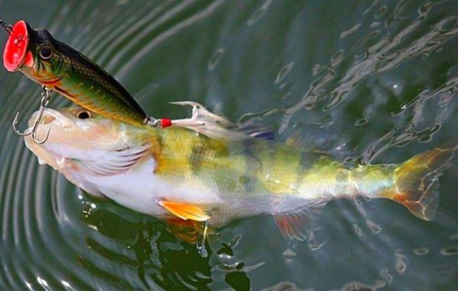 Вслед за снетком исчез и окунь. Как потом выяснилось, он перебазировался к тростнику и мелким буграм поросшим густой травой, и поменял питание на малька плотвы и другие бяки. Благо малька вдоль тростника местами было видимо-невидимо. В определенных точках, где рядом со стеной тростника соседствовали приличные глубины в 5-10 метров, то и дело возникали окуневые котлы. Тактика ловли окуня здесь укладывалась в схему: котел – поппер – твич – джиг т.е. когда возникал котел, в ход сразу шел поппер, и пока окунь чавкал, он налетал на поппер толпой. Садился на крючки по одному, по два, а бывали случаи и по три. Когда бой стихал, окунь чуть опускался и тогда я его долавливал на мелкий воблер.