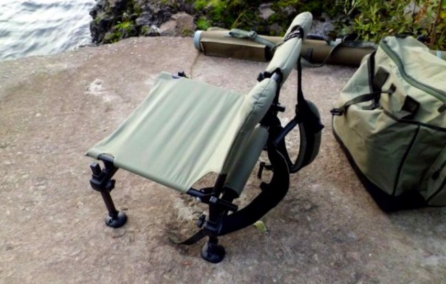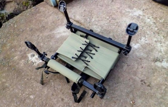 У кресла, как это не странно, четыре ноги. Две телескопические и две обычные. Тут же всплывает один из недостатков. А именно, даже телескопические ноги, довольно короткие. Максимально их можно выдвинуть на 500 мм. Так что, если вы захотите применять обвес для кресла, вы столкнетесь с серьезными проблемами по размещению. Посмотрите, с чем придется столкнуться при креплении кочерги Preston, с двумя точками опоры.