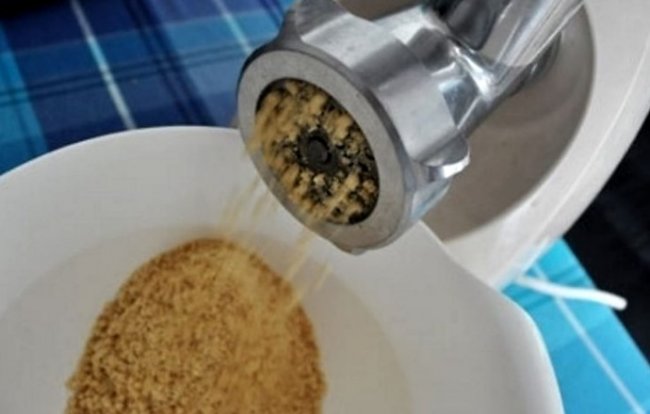 Итак, первое, что нам понадобится - это панировочные сухари, 4 стакана. Можно купить и в магазине, но я специально складываю горбушки от батона в специально отведенный для этой цели пакет. Потом перемалываю на мясорубке. Вот так: