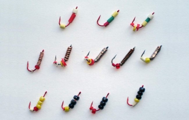 Крючок для этого нужен тонкий (чтобы бисер свободно надевался на цевьё), как правило, удлинённой формы (Limerik, Sproat, Kirby). Бисер - достаточно крупный, желательно обладающий собственной световой игрой, стеклянный или перламутровый - так называемый «парчовый». Цвет бисера подбирается в зависимости от того, какой кормовой объект требуется воссоздать. Для имитации мотыля - красный, опарыша - белый, личинки водяных насекомых - зелёный или коричневый.