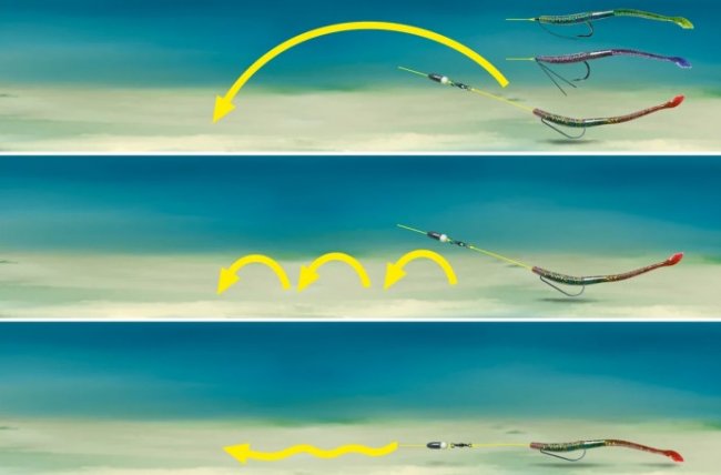 Каролинской оснастки существует много. С успехом применяется медленная плавная проводка по дну, без резких движений. Когда снасти поднимаются методом скручивания лески вверх, приманка скользит по воде и, расправляясь, опускается на дно. Между подъемом и опусканием следует делать паузы, длиной в несколько секунд. Приманка начинает естественно колебаться, и рыба атакует именно в такие моменты. Во время пауз производите мелкие подергивания кончиком спиннингового удилища.