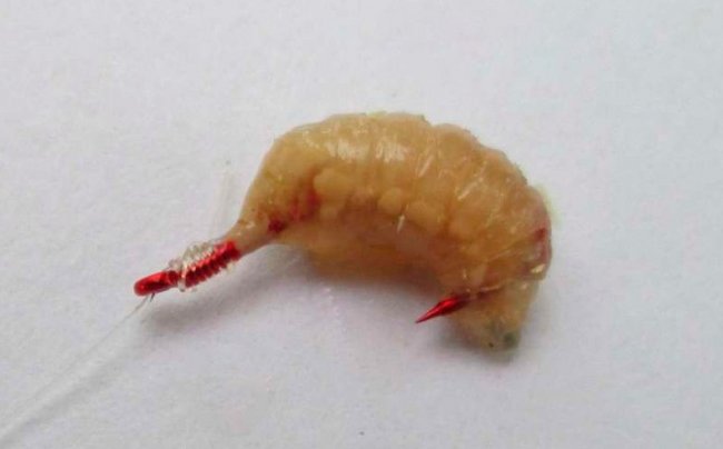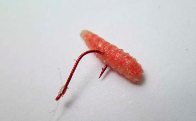 Распространенная ошибка начинающих рыболовов в том, что они пытаются сделать прокол через голову. Это неправильно, потому, что личинка в этом случае сжимает тело, головка втягивается внутрь, а это значительно осложняет весь процесс.