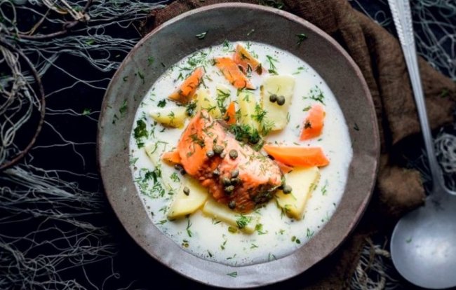 Налейте в посуду для приготовления ухи 3 - 4 литра воды, добавьте туда 1 среднюю головку репчатого лука (целиком), пол столовые ложки соли, 4 - 5 горошин перца, доведите всё это до кипения и дайте покипеть 3 -5 минут. Потом в кипящую воду с пряностями нужно кинуть 300 г - 400 г картошки (нарежьте кубиками) и немного моркови, как картофель наполовину сварится (попробуйте вилкой), киньте туда 500 г - 600 г рыбы. После этого добавьте в уху молоко перемешанное с пшеничной мукой (возьмите пол литра молока, добавьте в него полторы ложки пшеничной муки и перемешайте). Варите уху пока картошка и рыба не сварится, как уха сварится положите туда 1 столовую ложку сливочного масла и накрошите зелени (по пол пучка петрушки, укропа и зелёного лука). Всё, Финская уха готова.