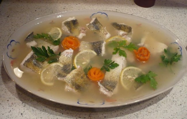 Мясо крупной тушки судака отделяем от костей и кожи, затем промываем и нарезаем маленькими порциями. Небольшие кусочки нарезанного мяса опускаем в закипевшую воду с солью и специями. Варим на небольшом огне в течение двенадцати минут. Готовую рыбу следует вынуть при помощи шумовки, выложить на сито и, прикрыв марлей выставить на холод. В отвар следует опустить голову судака с вычищенными жабрами, кожу с чешуёй и нарубленные кости. Добавляем лук репчатый, лист лавровый и перец душистый.