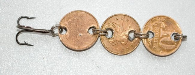 Еще один вариант изготовления уловистой блесны на окуня – из монет. Берем три монеты, в каждой сверлим по 2 отверстия на равном удалении друг от друга. Все три монеты соединяем в ряд заводным кольцами. На крайних отверстиях – ставим вертлюг и карабин. Монтируем блесну на спиннинг – идем выкашивать окуня на водоем.Блесна на окуня из пивной пробки