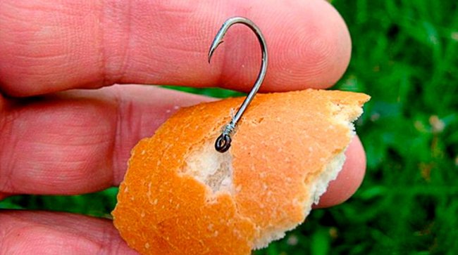 Из очень свежего хлеба формируется так называемый диск. Для этого из середины мякоти отщипывается кусочек, внутрь вкладывается крючок, насадка приплющивается пальцами.