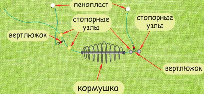 - Глухая. Подобно первому варианту леска продевается внутрь трубки, но не скользит там, а оборачивается вокруг кормушки и закрепляется узлами. Поводки с крючками могут закрепляться или на самой пружине, или монтироваться на основную леску.