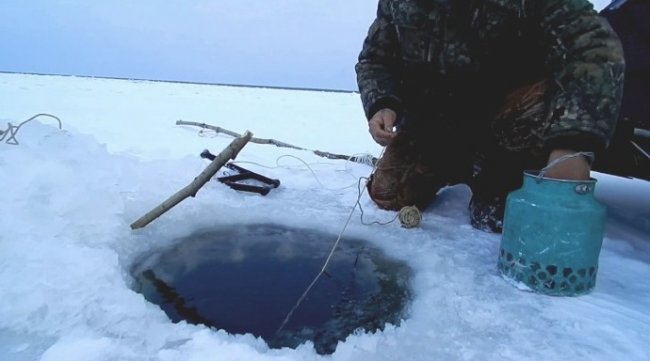 - Палка передается под ледяной коркой от лунки к лунке, пока не закончится шнур.