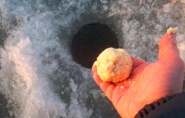 Смешиваем все ингредиенты, для большего аромата можно добавить естественного аттрактанта - ванили. В домашних условиях прикормку лучше всего хранить в сухом виде, а воду добавляют непосредственно перед началом ловли. После замешивания делаются накаты размером с грецкий орех и опускают в лунку. На одну лунку достаточно пары штук. Если активность клева снизилась, то можно подбросить еще дополнительный шарик. По плотности прикормочные шары должны быть разные, одна часть должна быть плотная, чтобы прикормка дошла до дна, а вторая часть рассыпчатая, чтобы раcтворилась в верхних слоях воды.