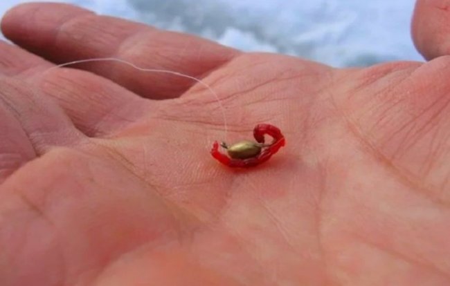 Особое внимание необходимо уделить правильному наживлению мотыля. Выбираем пару средних личинок(мотыля), наживляем их на крючок мормышки за головку и спускаем по цевью. Далее берем мотыля покрупнее и насаживаем его уже кольцом. Присмотревшись к игре мормышки, можно заметить, что она своей игрой напоминает чертика-медузу.