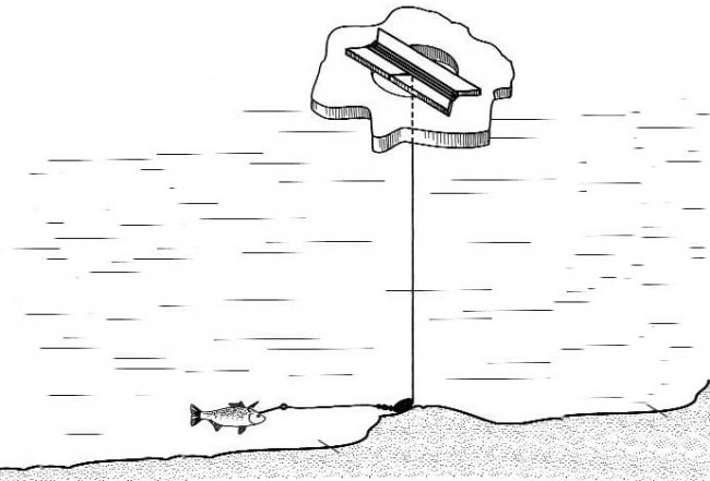 Установить поставушку очень просто, необходимо опустить на дно водоема нашу оснастку с приманкой. Затем отматываем дополнительно полтора, два метра лески и устанавливаем мотовило поперек пробуренной лунки, а леску пускаем через нашу прорезь посередине.